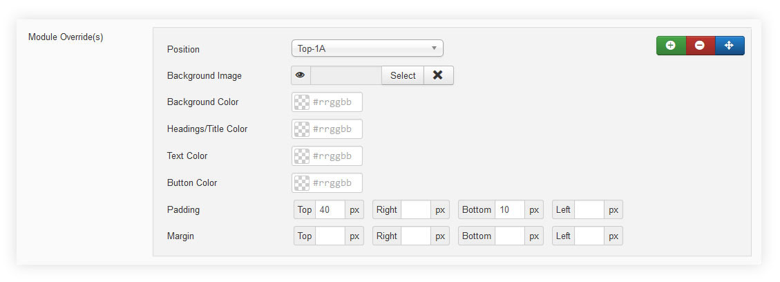 Module Style Overrides allow you to style individual module positions to your own taste. This greatly extends the control of how each of your module positions are displayed with a host of styling options including background image, background color, text color, heading color, button color and module padding. Multiple overrides can be created, each applied to the module position of your choice. Any module position with no override applied will continue to use the default template styling.